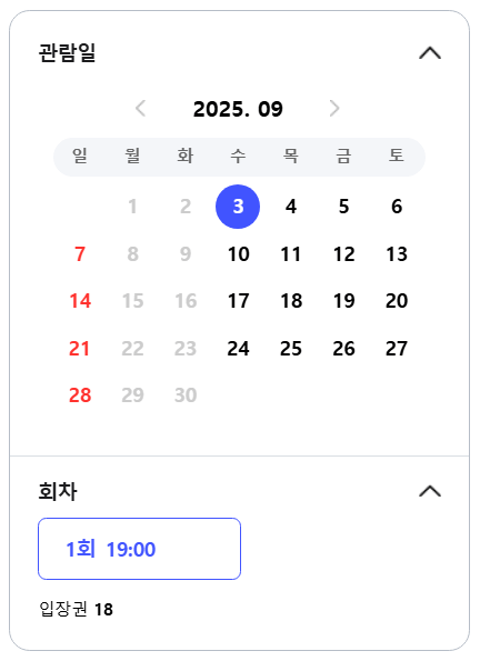 ① 방문하고자 하는 관람일/회차 선택 후 "예매하기"를 클릭하여 예매합니다.