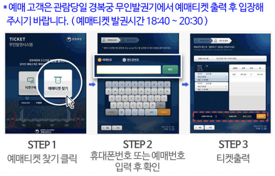 ② 관람당일 경복궁 무인발권기에서 출력 후 입장합니다.