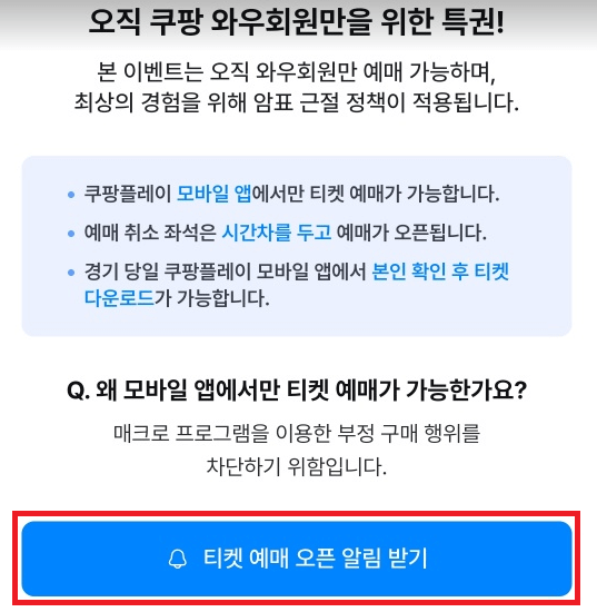 ❗쿠팡플레이 앱에서 티켓예매 오픈 알람받기를 신청하시면 예매시간을 놓치지 않고 예매가 가능합니다. 바로 설정하세요